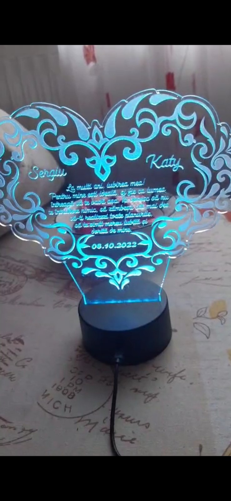 Surprinde persoana iubită cu o lampă LED unică, ideală pentru a transmite emoție și căldură. Realizată din sticlă acrilică de înaltă calitate, această lampă dispune de 7 variante de culoare interschimbabile, oferind un ambient plăcut și romantic.